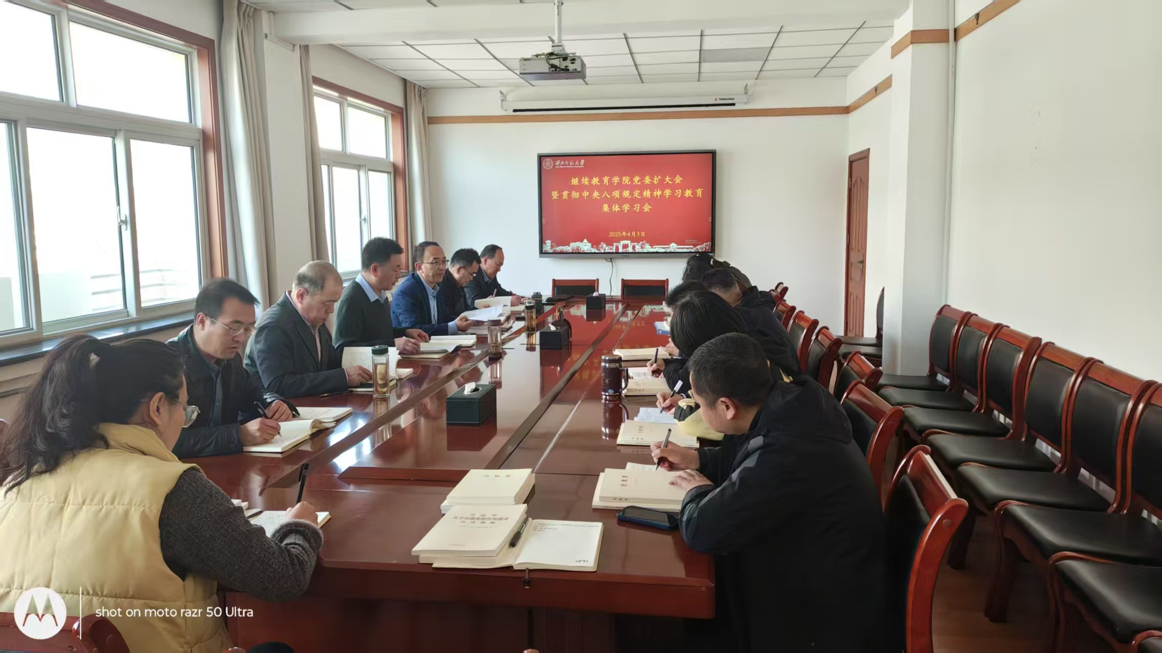 按照开展深入贯彻中央八项规定精神学习教育总体安排,4月3日下午,继续教育学院党委召开深入贯彻中央八项规定精神学习教育读书班暨党委理论学习中心组集体学习会,认真学习习近平总书记关于加强党的作风建设的重要论述和中央八项规定及其实施细则精神。党委书记陈科主持并讲话,院长赵辉、甘肃省教育发展中心常务副主任王文槐、副院长姚军、李玉泉、马占寿、党委委员王琦玉、丁波以及教工支部全体党员参加集体学习。