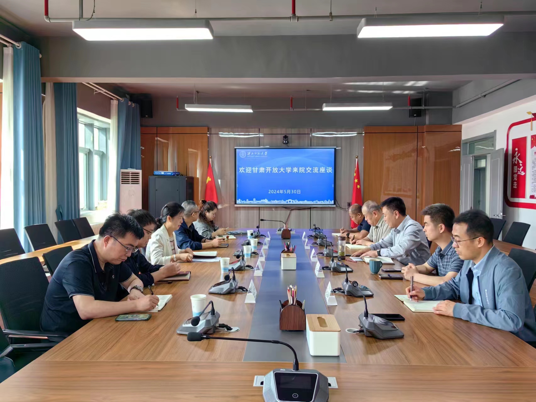 5月30日,甘肃开放大学副校长丁霞,事业发展处处长杜东绪,开放教育学院副院长赵利明,质量监控处副处长张薇,党政办公室副主任包正桦来院调研交流并召开座谈会。学院副院长姚军、李建升、马占寿参加座谈会。院长赵辉主持会议。