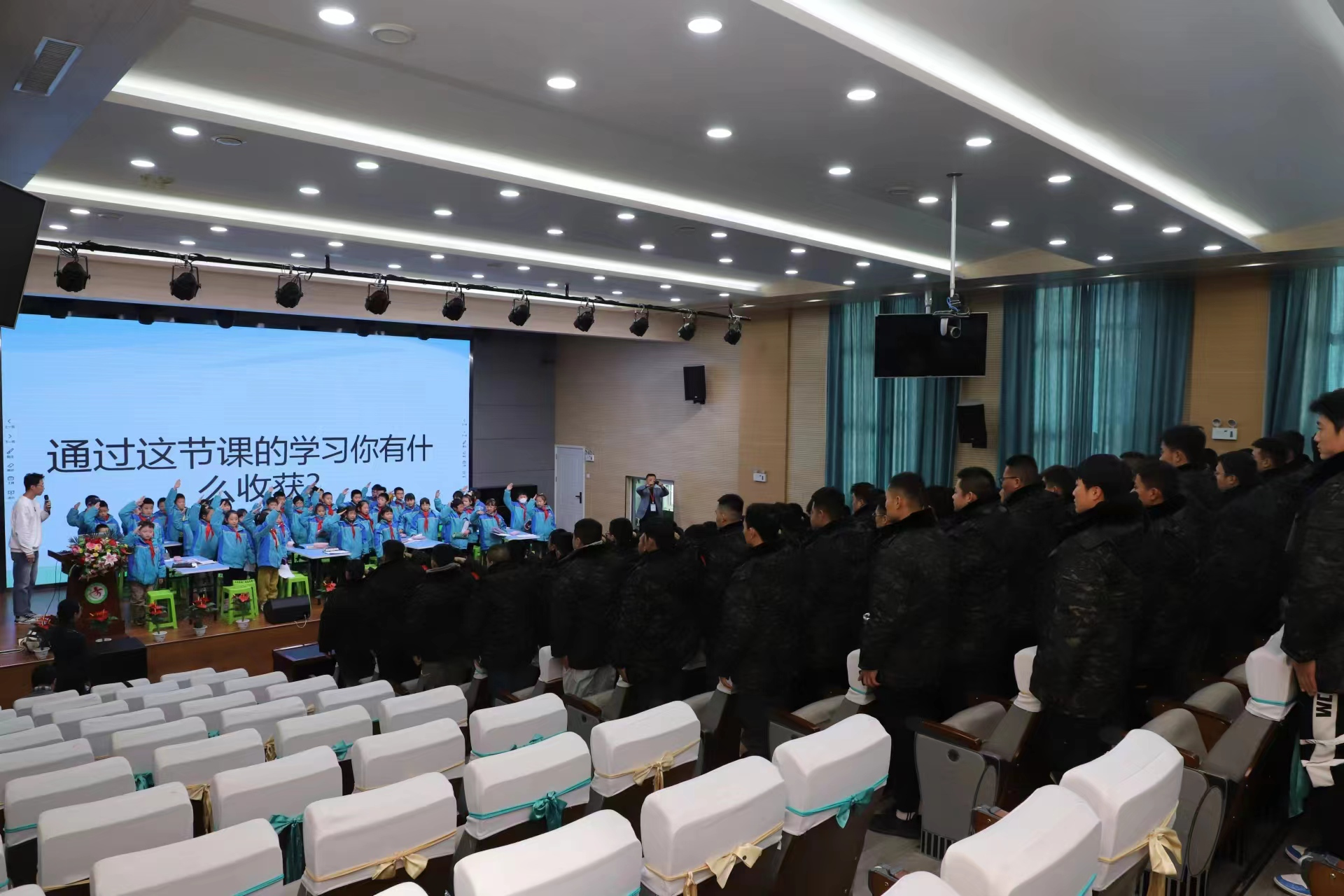 活动结束后,42名小学3年级学生怀着崇敬之情,向退役军人参训学员致以少先队礼,120名退役军人整齐划一还以“军礼”,未来的“兵教师”和祖国的“花朵们”以这种方式互动,刹时温暖了整个会场。