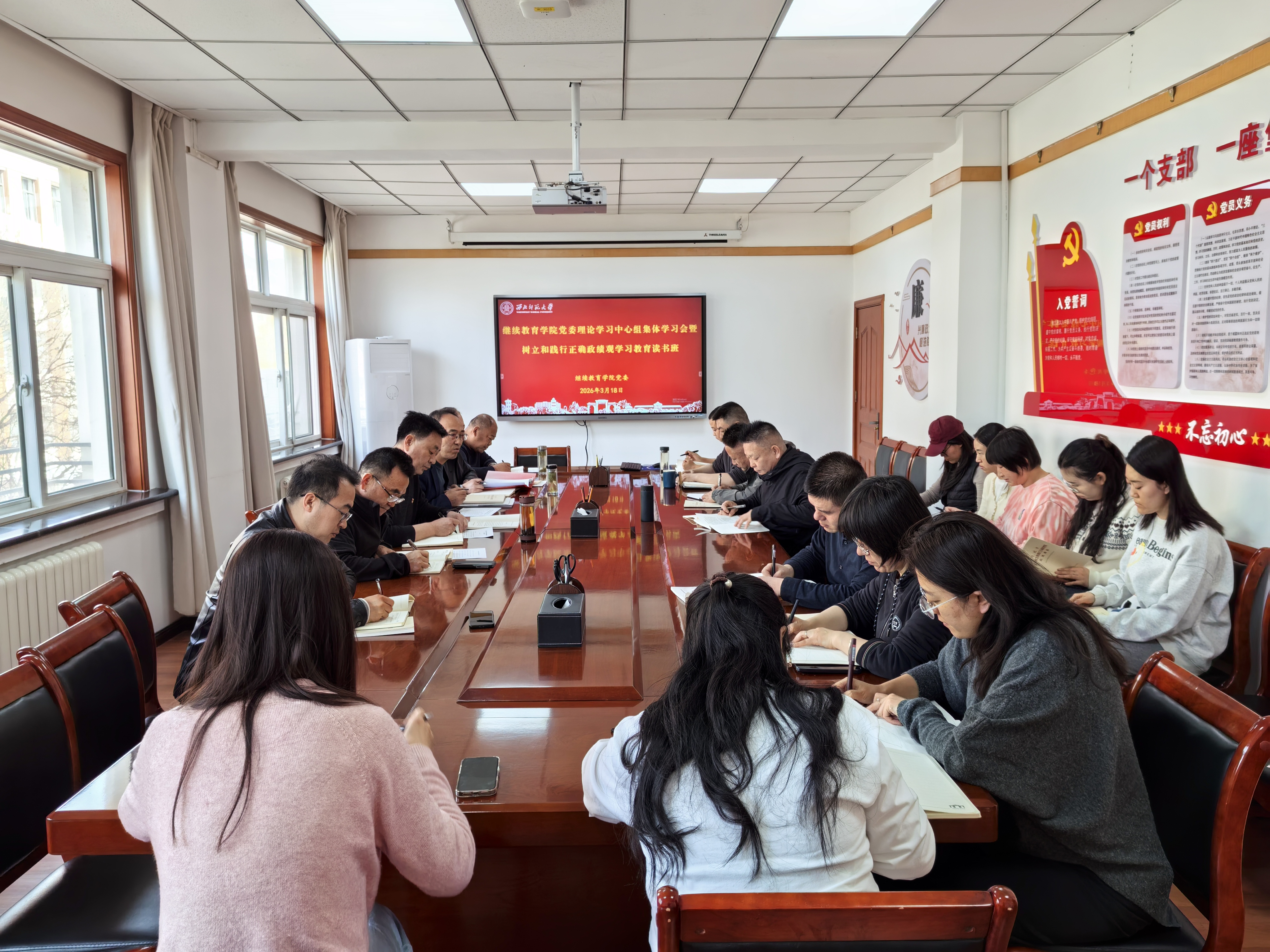 3月18日,继续教育学院召开党委理论学习中心组集体学习会暨树立和践行正确政绩观学习教育读书班。党委书记陈科主持会议并讲话。院领导赵辉、王文槐、李玉泉、马占寿出席会议。党委委员、职工全体党员和入党积极分子参加会议。